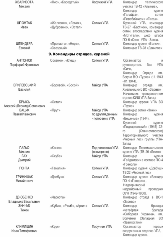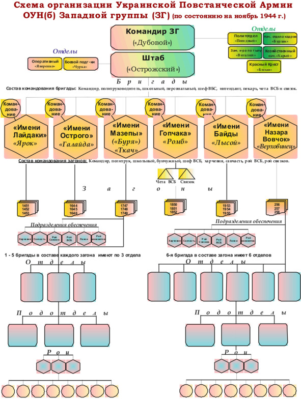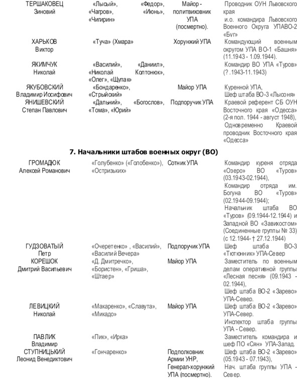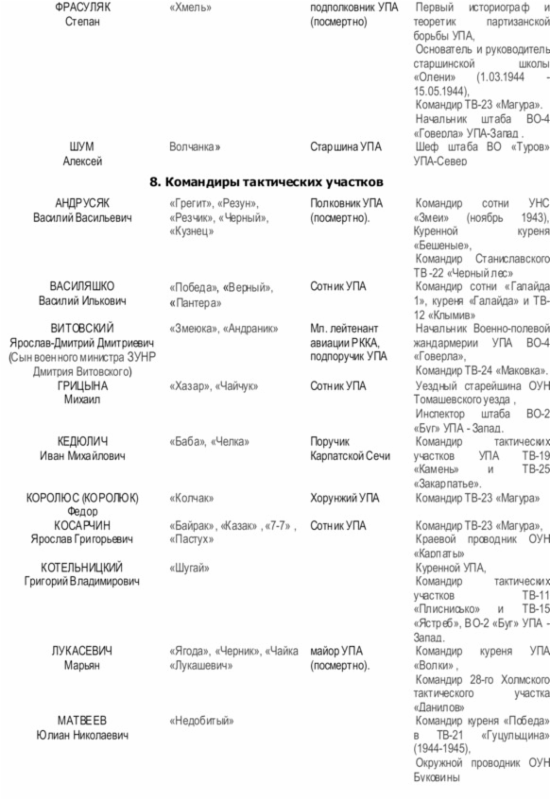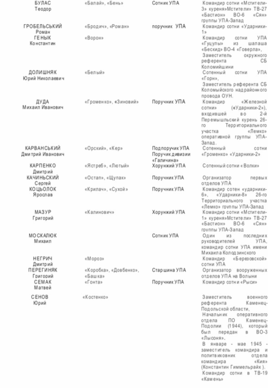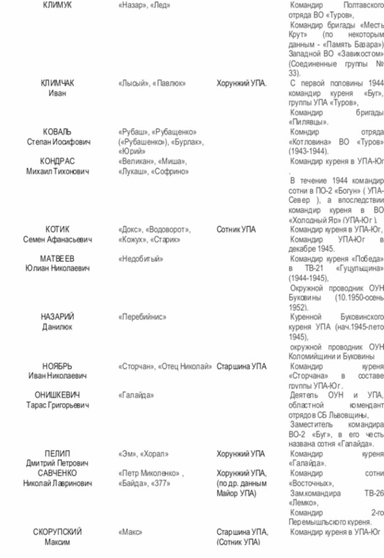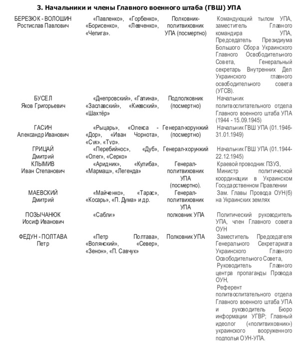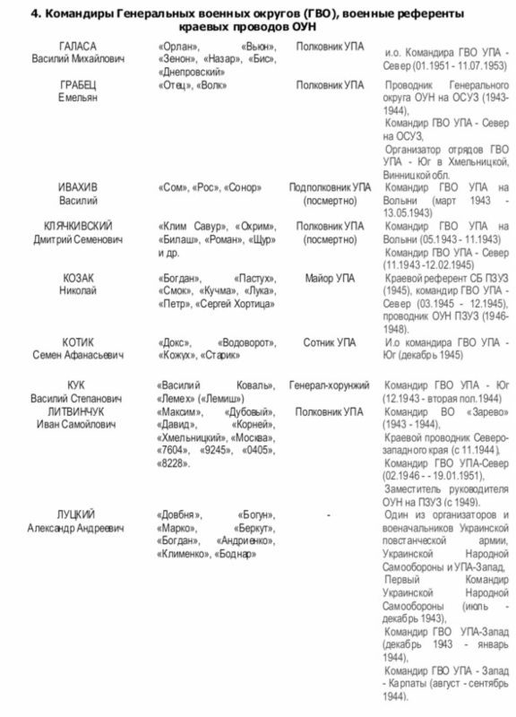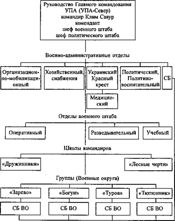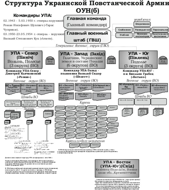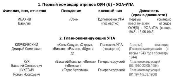 Начальником Главного военного штаба (ГВШ) УПА (с 01.1944 г. по 22.12.1945 г.) был Дмитрий Грицай («Перебейнос»)[3], руководителем СБ (службы безопасности в УПА до зимы 1943 г.) — Дмитро Клячкивьский (псевдонимы[4] «Клим Савур», «Охрим», «Билаш», «Роман, «Щур» и другие)[5].