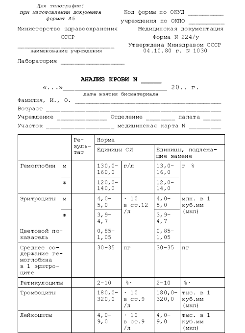 И, наконец, самое главное. Мы отталкиваемся от бланков форм, утвержденных Минздравом. Только общий анализ крови содержит действующие нормы показателей.
