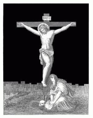 The beneficent seasons of Spring and Summer coming to an end at the Autumnal Equinox, the 22d of September was made the anniversary of the Autumnal Crucifixion. The vernal resurrection and Autumnal Crucifixion, representing the alternate triumph of the personified principles of Good and Evil, as manifested in the diversity of the seasons; we find appropriately expressed in two religious pictures. In the one, the Saviour, appealing as a vigorous young man, surrounded by a brilliant halo, representing the rays of the all-conquering Sun of Spring, is rising triumphantly from the tomb, before whom the demon of Winter, or Devil, is seen retreating in the background. In the other, the vanquished Saviour, represented by the figure of a lean and haggard man, with a crown of thorns upon his head, around which appears a faint halo of the Sun's declining rays, and above which is placarded the letters I. N. R. I., the initial letters of Latin words, signifying the life to come, or the eternal life, is suspended upon the cross, at the foot of which his mother Mary (Virgo) is represented as kneeling in a mourning attitude, and by her side is seen a serpent and a skull, the emblems of Evil and of Death.