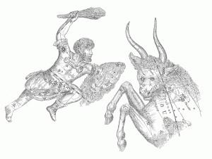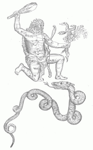 Personifying the principles of Good and Evil in God Sol, the ancient Astrologers consecrated the six divisions of the 12,000 year cycle, corresponding to the reproductive months of Spring and Summer, to him as Lord of Good, and symbolizing him by the constellation of the Zodiac in which the Vernal Equinox successively occurred, as explained hereafter, they dedicated the six divisions of that cycle, corresponding to the destructive months of Autumn and Winter, to him as Lord of Evil, and as such, symbolizing him by the serpent, marked the beginning of his reign by the constellation "Serpens," placed in conjunction with the Autumnal Equinox. Personifying in him the opposing principles of Good and Evil, he was to the ancients both God and Devil, or the varied God, who, in relation to the seasons, was described as beautiful in Spring, powerful in Summer, beneficent in Autumn and terrible in Winter. Thus under various names, intended to represent God Sol in relation to the diversified seasons, we find recorded in the Scriptures, or solar fables, numerous portrayals of imaginary conflicts, in which the Evil principle, triumphing during Autumn and Winter, is conquered at the Vernal Equinox by the Good principle, who, bringing back equal days and nights, restores the harmony of nature.