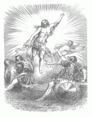 Celebrating the anniversary of the ascension forty days after Easter, it was anciently observed on the 4th of May, and it was taught that the incarnate saviours ascended bodily into heaven, in a golden chariot drawn by four horses caparisoned with gilded trappings, all glittering like fire in the fervid sunlight. Hence when we read in II. Kings ii. 11, that "There appeared a chariot of fire and horses of fire, . . . and Elijah went up by a whirlwind into heaven," we must accept this text as descriptive of the imaginary ascension of one of the incarnate saviours of ancient Judaism.