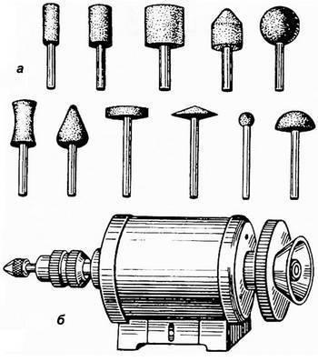 Рис. 3.1. Заточный инструмент: а – абразивные головки; б – двигатель с насадками
