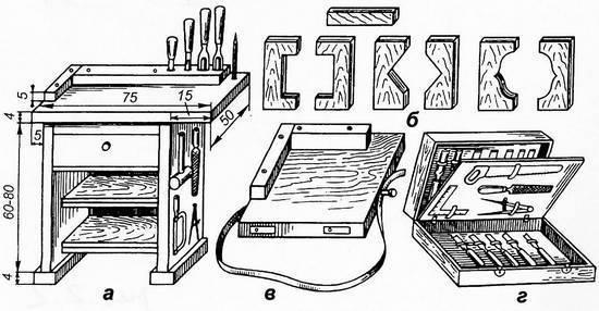 Рис 2.2. Принадлежности рабочего места: а – рабочий стол; б – наколенный упор; в – державки; г – чемодан для инструмента