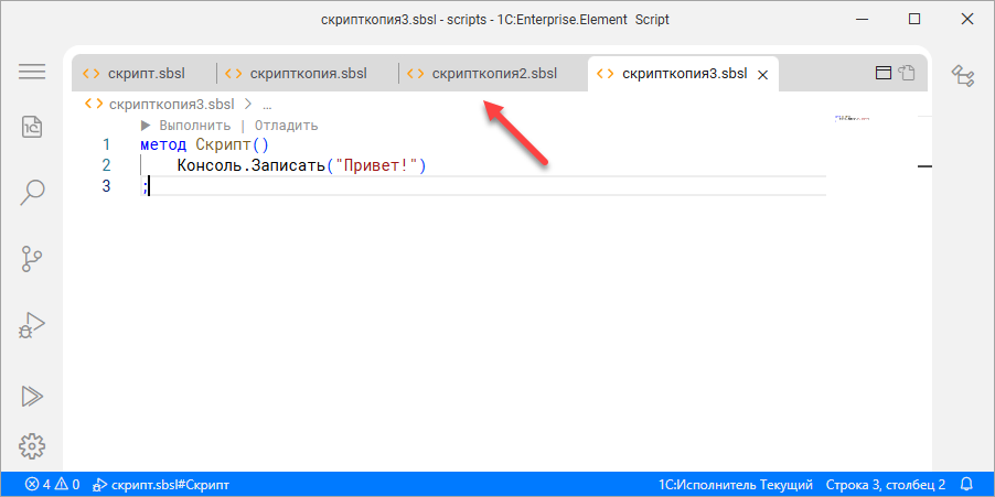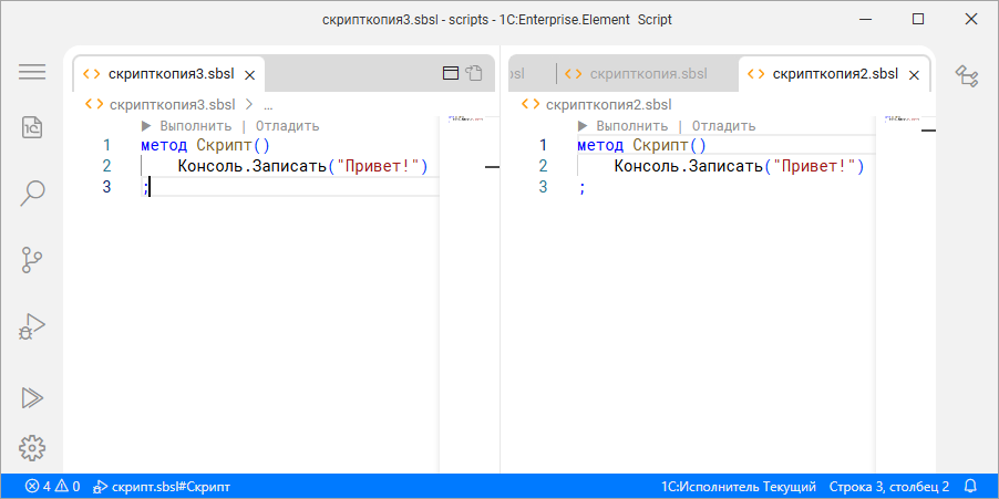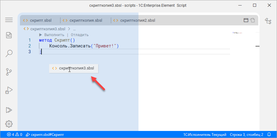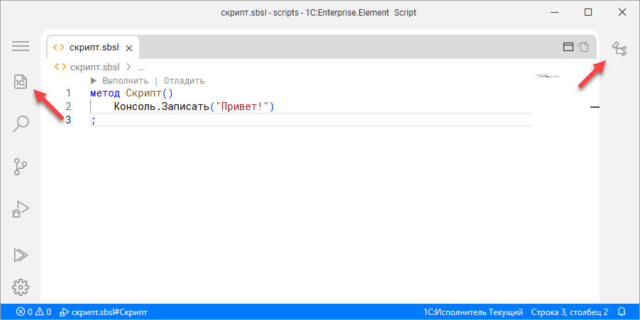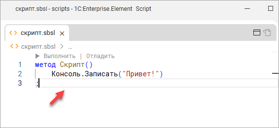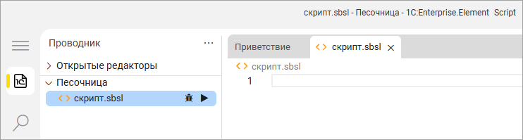Файл скрипт.sbsl, который вы создали, называется скриптом, так же как и сама программа, которая в нём находится. Скрипт – это специализированная программа, написанная на высокоуровневом языке. От «обычных» программ она отличается своим назначением. Обычно скрипт выполняет набор рутинных или служебных действий, связанных с эксплуатацией, взаимодействием, обменом данными, настройками, управлением и обслуживанием информационных систем. Скрипт «1С:Элемента» – это текстовый файл, который всегда имеет расширение .sbsl.