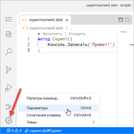 Слева в нижней части панели действий находится «шестерёнка» Управление, которая позволяет вам открыть Параметры – настройки среды разработки. Вы можете настроить внешний вид среды, свойства редакторов и другие параметры.