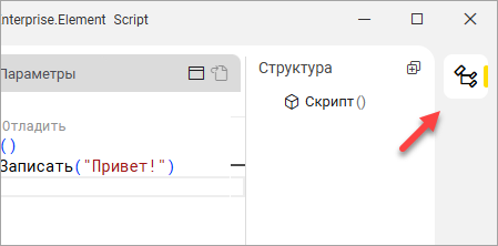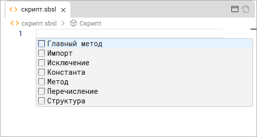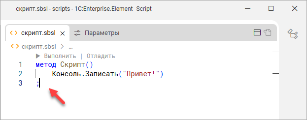 - Нажмите Главный метод. Среда разработки «1С:Предприятие.Элемент» вставит шаблон метода Скрипт() и переместит курсор во вторую строку с отступом.