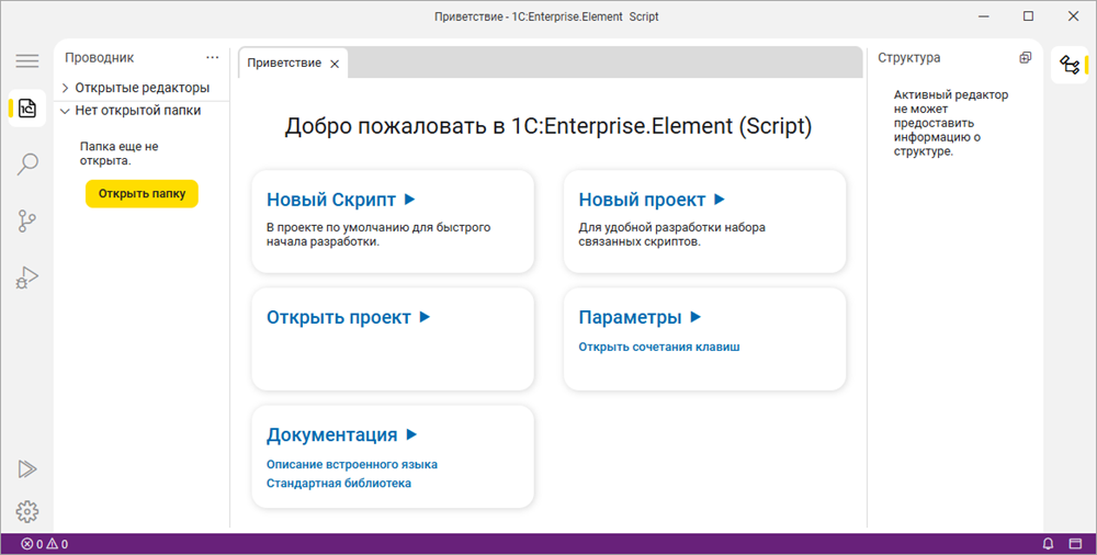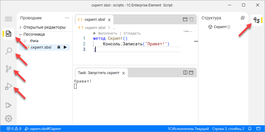 Программа, с помощью которой вы написали текст своего скрипта и запустили его на выполнение, – это среда разработки. Она называется «1С:Предприятие.Элемент». Это современная среда разработки, которая позволяет создавать, модифицировать и отлаживать скрипты. Она имеет развитые средства синтаксической помощи и контроля. Эта среда может функционировать не только локально, на вашем компьютере, но и в Интернете. Таким образом, вы можете разрабатывать скрипты удалённо, через Интернет, на неподготовленном компьютере. Достаточно иметь только браузер.