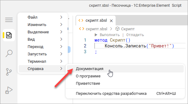 По мере изучения языка «1С:Элемент» вам понадобится обращаться к справочным данным по языку и по типам, которые он использует. В книге будут ссылки на нужные интернет-страницы. Помимо этого вы самостоятельно можете открыть руководство разработчика – Главное меню > Справка > Документация.