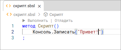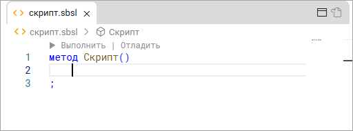 - Среда разработки откроет файл вашего скрипта, и вы можете писать в нём код.
