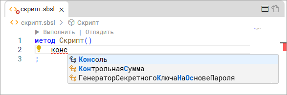 - Начните писать конс – появится контекстная подсказка, нажмите в ней Консоль.