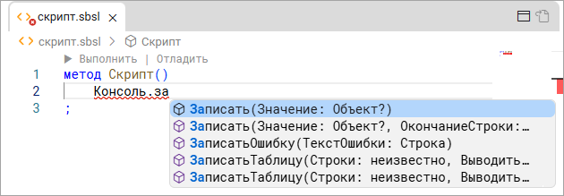 - Поставьте точку и начните писать за. Появится контекстная подсказка, нажмите в ней Записать(Значение: Объект?).