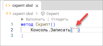 - Нажмите двойную кавычку «"». Среда разработки автоматически удвоит её так, чтобы вы могли написать текст в кавычках.