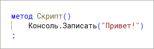 Сейчас вы написали одну инструкцию Консоль.Записать("Привет!"). Чёрным цветом среда разработки «1С:Предприятие.Элемент» раскрасила Консоль и Записать – это нечто, что среде разработки известно. Нечто, что она знает, умеет и может делать без дополнительных объяснений. Вспомните: она подсказывала вам эти слова в своей контекстной подсказке.