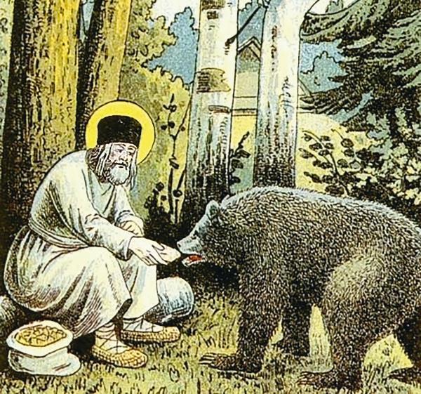 Серафим кормит медведя. Фрагмент литографии