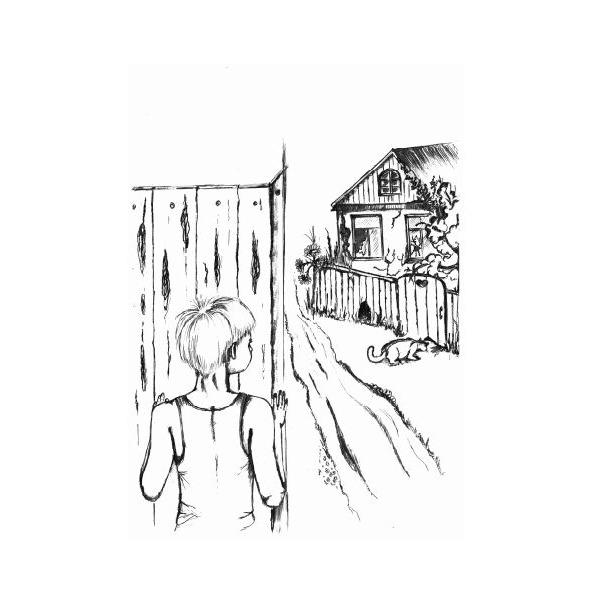 «Ага! — подумал юный охотник. — Ну, теперь-то ты попался». Рядом в заборе была наполовину выломана доска. Никита скользнул в дыру и, стараясь не шуршать, пополз вперёд. Подкравшись, протянул руки и уже хотел схватить кота за пушистый хвост, как вдруг в доме послышались шаги. В глубине веранды распахнулась дверь и в проёме возникла чёрная фигура.