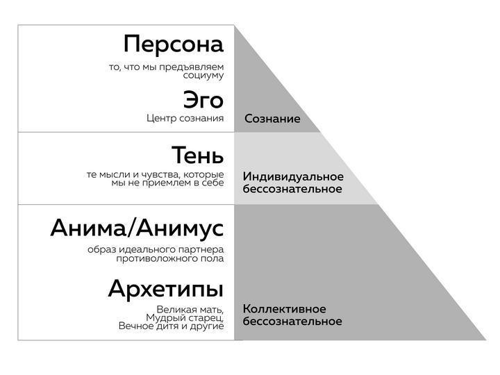 Согласно Юнгу, психика человека состоит из 3-х основных компонентов: сознательное, личное бессознательное и коллективное бессознательное. Каждый из этих компонентов содержит в себе дополнительные составные элементы. Так, например, сознание состоит из Персоны и Эго. Эго представляет собой часть психики, отвечающую за осознание себя и своих действий. Оно управляет рациональным мышлением. Персона же представляет собой социально принятую маску, которую индивидуум показывает миру. Такая маска включает в себя принятые в обществе социальные роли и нормы поведения, которые человек выполняет, чтобы соответствовать ожиданиям общества.