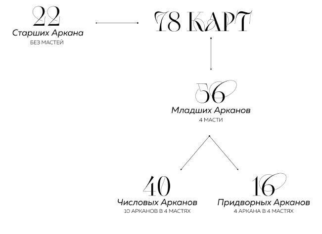 Колода Таро состоит из 78 карт, которые делятся на 2 большие группы: Старшие Арканы и Младшие Арканы. Младшие Арканы разделяются еще на две подчасти: Числовые Арканы (число + масть) и Придворные Арканы (ранг + масть). Каждая карта колоды Таро обладает своим уникальным символическим значением и содержит глубокие архетипические образы.