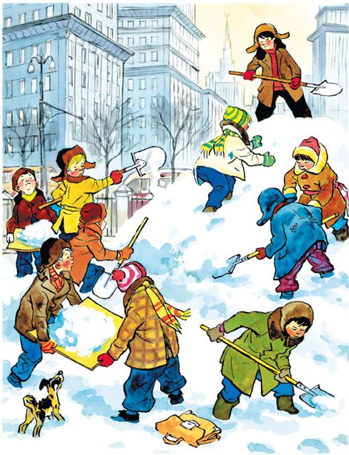 Целый день ребята трудились – строили снежную горку во дворе. Сгребали лопатами снег и сваливали его под стенку сарая в кучу. Только к обеду горка была готова. Ребята полили её водой и побежали домой обедать.