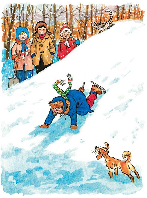 А Котька Чижов из шестой квартиры хитрый какой! Он горку не строил. Сидит дома да смотрит в окно, как другие трудятся. Ему ребята кричат, чтоб шёл горку строить, а он только руками за окном разводит да головой мотает – как будто нельзя ему. А когда ребята ушли, он быстро оделся, нацепил коньки и выскочил во двор. Чирк коньками по снегу, чирк! И кататься-то как следует не умеет! Подъехал к горке.