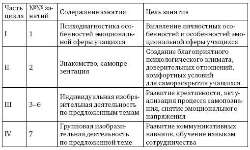 Цикл психопрофилактических и развивающих занятий, созданный автором, относится к групповой арт-терапии, которая характеризуется наличием периодов погружения участников группы в свой собственный внутренний мир через индивидуальную изобразительную работу и периодов их тесного взаимодействия на этапе презентации и обсуждения работ.
