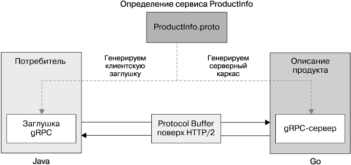 Определение сервиса находится в файле ProductInfo.proto, который используется для генерации кода как на серверной, так и на клиентской стороне. В этом примере мы исходим из того, что сервис написан на языке Go, а потребитель — на Java. Сетевое взаимодействие обоих объектов происходит по HTTP/2.