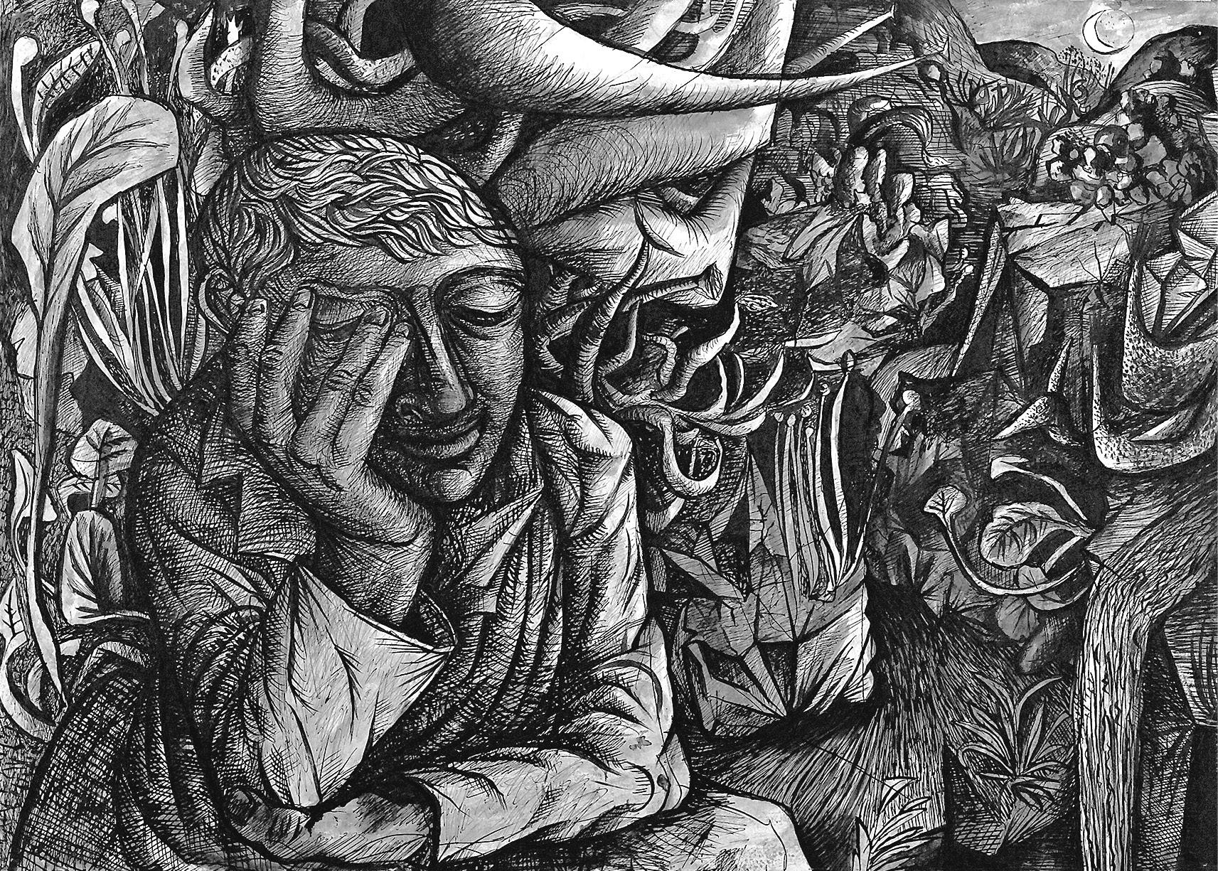 Творчество большинства перечисленных выше художников (кроме Фрейда) было отмечено тягостным сочетанием ностальгии и кошмара. Рисунок Кракстона тушью и мелом Спящий в пейзаже (1942) — одна из его ранних и самых памятных работ. Полумесяц заимствован у романтика девятнадцатого века Сэмюэла Палмера, к чьим работам тогда вновь пробудился интерес (Минтон шутил по поводу того, насколько полумесяц оказался «кстати» во время войны), в то время как угрожающе-колючие растения ближе к миру Герники Пикассо, чем к сельской идиллии.