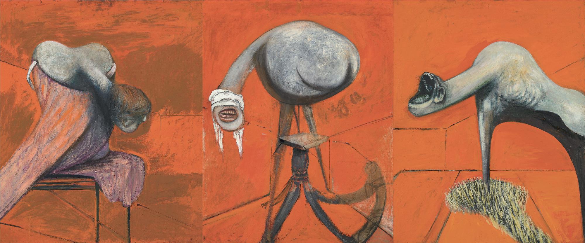 Посетители выставки были ошеломлены полотнами Бэкона. По словам Джона Рассела, те приводили людей «в полное оцепенение» [10]. Центральная фигура напоминала страуса без перьев, чья длинная, толстая, трубчатая шея заканчивалась неловко забинтованным человеческим ртом. Как и его сотоварищи с обеих сторон, он казался загнанным в угол и готовым к нападению, «ждущим возможности стащить зрителя вниз, на свой уровень» [11]. Это были «настолько беспросветно-ужасные образы, что при виде их мозг со щелчком схлопывался» [12]. Это было искусство, способное повергнуть зрителя в шок, но мимо него было трудно пройти. Кошмар не просто таился в пейзаже, незримый, как в работах неоромантиков: он был здесь, огромный и ужасный, он надвигался на вас.