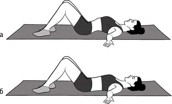 Лягте на пол: ноги согнуты, стопы стоят на полу (рис. 3, а). Сделайте вдох, а на выдохе подкрутите таз и прижмите поясницу к полу (рис. 3, б). Сделайте снова вдох, оставаясь в том же положении. Продолжайте цикл дыхания, контролируйте поясницу – она должна быть прижата к полу. Это и есть нейтральное положение таза. Теперь нам нужно сделать то же самое в положении стоя. Для этого встаньте прямо, ноги вместе, пятки близко друг к другу, носки слегка врозь.