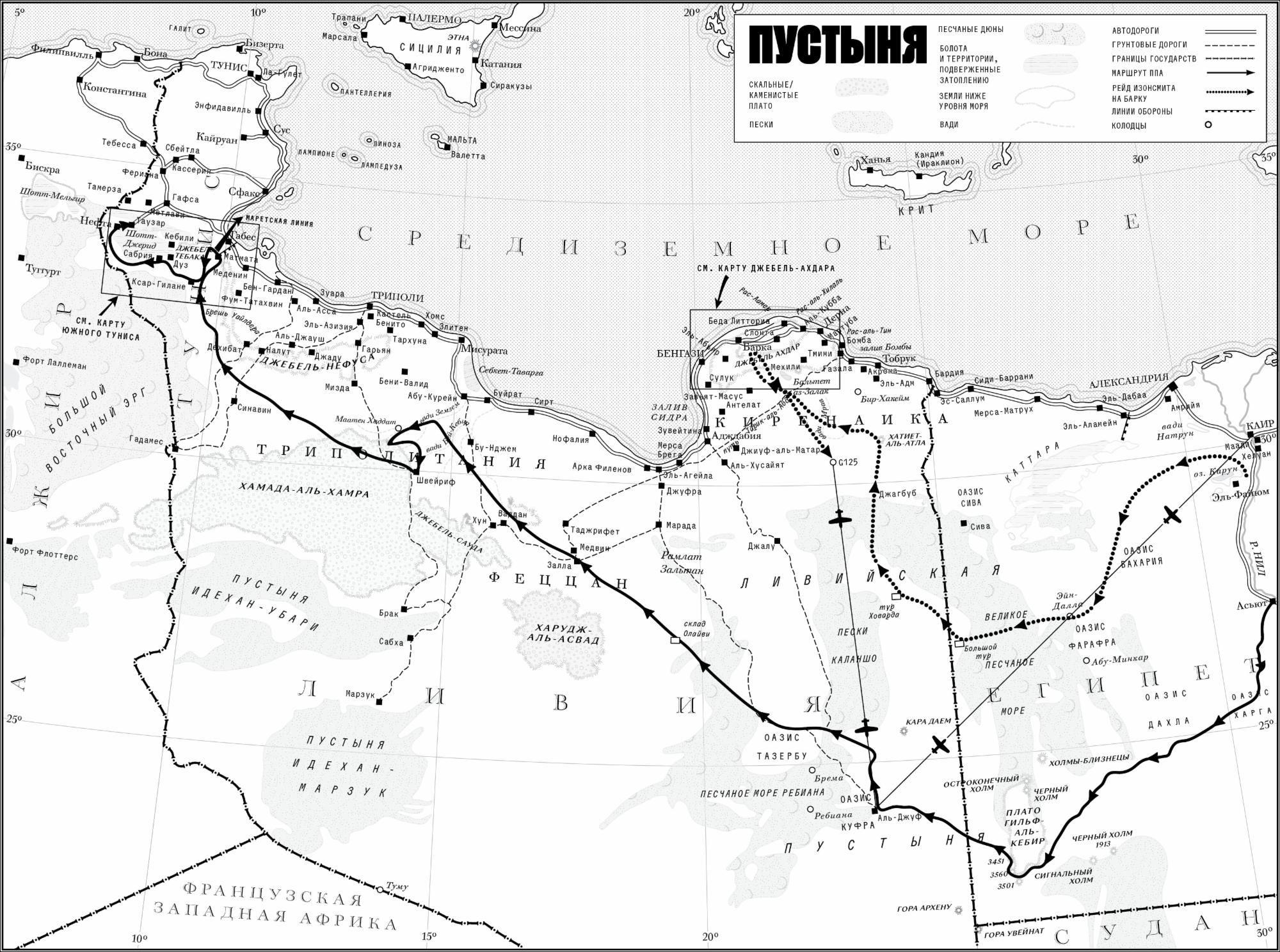 Лагерь в Абу-Мине, в котором я просидел целый год, был нашим форпостом перед пустыней. Второе из перечисленных наступлений я наблюдал лично и высадился в Тобруке через несколько дней после его освобождения в составе конвоя, в который входили два батальона Ливийской арабской армии.