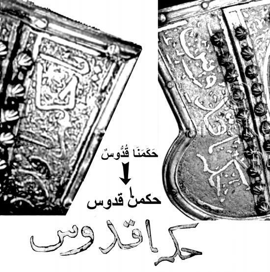 По нашему мнению, до 2009 года историки НАМЕРЕННО скрывали от общественности содержание этой надписи. Делая вид, будто бы ее невозможно прочесть. Дескать, это лишь бессмысленное подражание арабской письменности, и т. д., и т. п. А когда надпись, на их беду, все же прочел иранский консул, они, чтобы сохранить лицо, сделали вид, будто бы консул воспользовался своими знаниями «редких, неизвестных специалистам арабских диалектов». Это неправда. Консул прочитал надпись так, как прочитал бы ее любой другой человек, знающий арабский язык. В чем мы лично убедились, отнеся эту надпись на прочтение преподавателю арабского языка Б. М. Анка. Который, кстати, ровным счетом ничего не знал ни об этой надписи, ни о ее прочтении иранским консулом. Он с ходу легко прочитал в ней то же самое – «АЛЛАХ МАГОМЕТ», повторенное несколько раз.