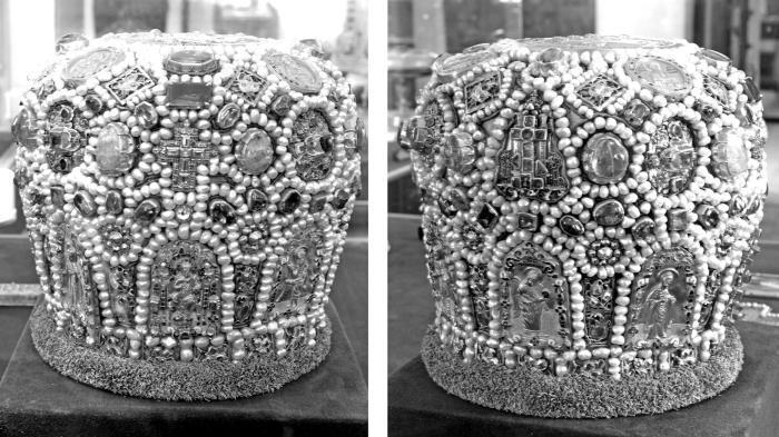 Рис. 11. Митра, вложенная князьями Мстиславскими в Троице-Сергиеву лавру в 1626 году. Снимки митры с двух сторон, 2012 год