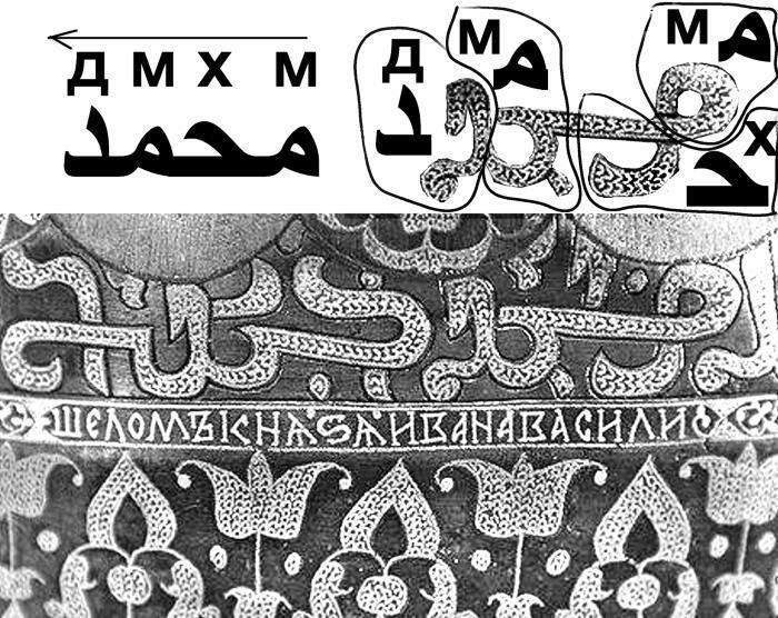 Рис. 2. Арабская и русская надписи на шлеме Ивана Грозного. Сверху показано, как именно здесь написано имя «Магомет», состоящее из 4 арабских букв: Мим-Ха-Мим-Даль (МХМД)