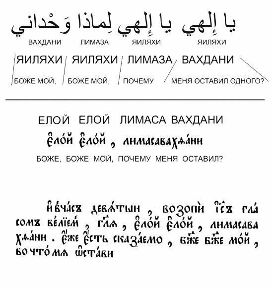 Евангелия только в одном месте приводят звучание речи Христа – причем сопровождают ее переводом. В церковнославянском Евангелии московской печати 1651 года это место у Матфея и у Марка (другие евангелисты его не приводят) звучит так: «О девятом же часе возопи Исус гласом велием, глаголя: “Или, Или, лимасавах<θ>ани”, еже есть “Боже мой, Боже мой, вскую («почему» – Авт.) мя еси оставил”» (Мф. 27:47); «И в час девятый возопи Исус гласом велием, глаголя: “Елой, Елой, лимасавах<θ>ани”, еже есть сказаемо “Боже, Боже мой, во что мя остави”» (Марк 15:34). Заметим, что церковнославянская буква «фита» может читаться как Ф или Т, а пишется очень похоже на Д.