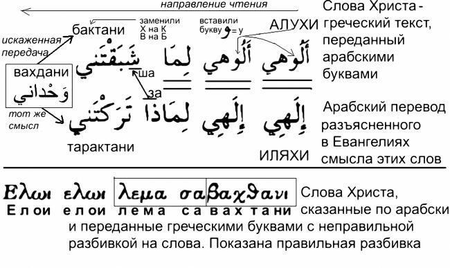 Поясним, что сегодня в сирийской христианской церкви богослужение ведется на арабском языке. Соответственно, там используются Евангелия на арабском языке, которые являются переводом с греческого. Казалось бы, прямая речь Христа в этом переводе должна была быть передана в точности, буква в букву, как в греческом тексте. Но это НЕ ТАК. Причина, видимо, в том, что иначе арабоязычный читатель мог бы заметить, что Христос произнес свои слова по-арабски. Чтобы не допустить этой «крамольной мысли», в транслитерацию прямой речи Христа арабскими буквами, по сравнению с греческой транслитерацией, были внесены небольшие, но важные изменения. А именно: