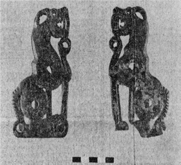 В этой связи особое внимание привлекает коллекция вылитых из бронзы предметов, поступивших в Иркутский областной краеведческий музей в канун 1981 года. Все находки происходят из клада, обнаруженного вблизи д. Корсуково Качугского района на берегу речки Жуя, левого притока Лены. Клад был найден трактористом совхоза им. Фрунзе П. К. Трифоновым во время, работ по раскорчевке леса. С глубины 20—25 сантиметров плугом был вывернут бронзовый котел, в котором, замазанные слоем глины, помещались 7 бронзовых изделий. К сожалению, один предмет вскоре был утерян. Из шести оставшихся — пять наверший и одна подвеска. Два навершия отлиты в виде сидящих на задних лапах оскалившихся хищников из семейства кошачьих (см. фото), еще два венчают реалистически выполненные полые скульптурки безрогих лосей с шариками внутри и, наконец, пятое — шар с прорезями на цилиндрической ножке. Особое место в коллекции занимает подвеска в виде изгибающегося дракона, на теле которого помещены две фигурки животных — лося и настигающего его хищника.