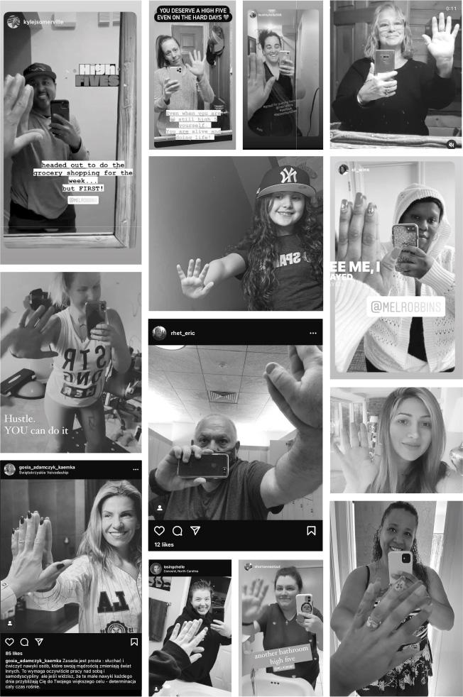 Не прошло и часа, как люди в разных уголках мира начали делать то же самое — давать себе пять и снимать это. Я была потрясена: мужчины, женщины, дети, бабушки, дедушки; перед работой, перед школой, просто спозаранку. Люди самого разного возраста и происхождения выкраивали минутку, чтобы поприветствовать себя в зеркале.