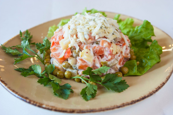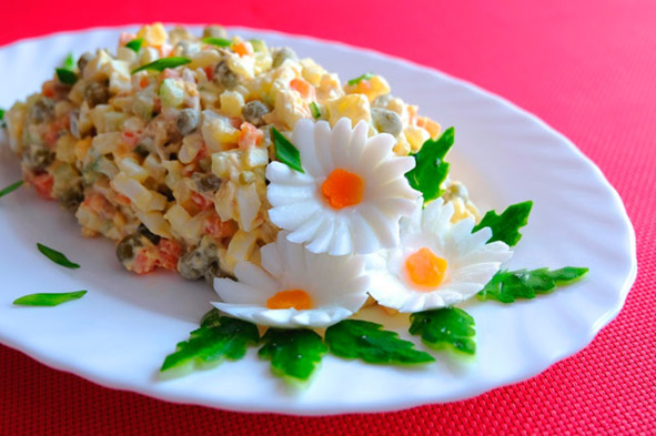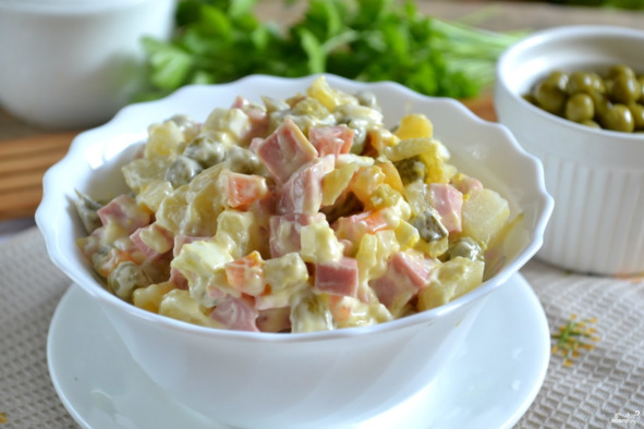 Одним из символов новогоднего застолья является Салат «Оливье», который как ни как лучше подходит для зимних праздников. Превосходное сочетание ингредиентов, доступность продуктов сделали блюдо на столько популярным, что теперь мясной салат с майонезом готовят повсеместно, по случаю и без.