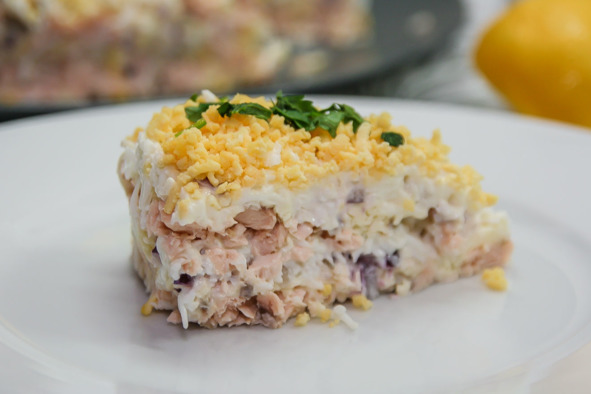 Наутро разъемную форму можно будет аккуратно снять — салат будет держаться в форме торта.
