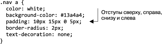 Порядок необходимо запомнить, чтобы избежать потенциальных проблем. Навигационные ссылки, показанные на рис. 1.13, имеют следующие отступы: верхний — 10 пикселов, справа — 15 пикселов, снизу — 0, слева —5 пикселов. Выглядит некрасиво и неровно, но зато демонстрирует принцип работы сокращенной записи.
