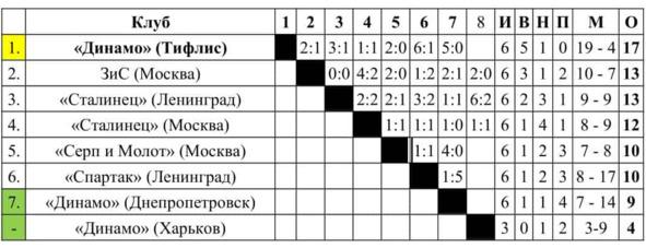 — Участие в чемпионате приняло 7 команд, 116 футболистов. Проведён 21 матч, забито 85 мячей. Лучший бомбардир — Михаил Семичастный «Динамо» (Москва) — 6 мячей. Зафиксировано 4 автогола, 7 пенальти, 1 удаление. Игры обслуживали 17 арбитров. Средняя посещаемость — 22400 зрителей.