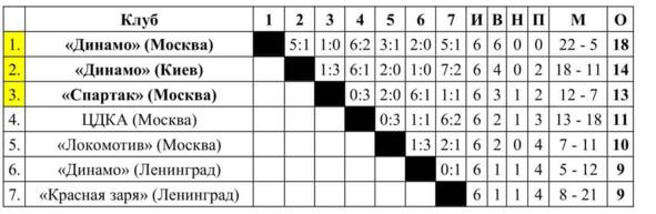 — Чемпион — «Динамо» (Москва): А. Квасников (вратарь (далее — в), принял участие в 5 матчах), Е. Фокин (в, 2), Л. Корчебоков (5), В. Тетерин (5), П. Коротков (4), А. Лапшин (5), Е. Елисеев (6), А. Ремин (6), В. Дубинин (1), М. Семичастный (6, забил 6 голов), М. Якушин (5, 1), В. Смирнов (6, 5), В. Павлов (6, 5), С. Ильин (6, 4), А. Пономарёв (1). Старший тренер — К.П.Квашнин.
