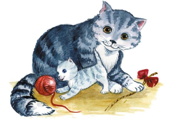 Подросли котята — мы почти всех раздали, только одного оставили. Матрёшка серая в чёрную полоску, а котёнок голубенький в серую полоску. И тут Матрёшка прежней стала: резвой, игривой. И котёнок от неё не отстаёт — весь в мать. Оно и хорошо — нам веселее.