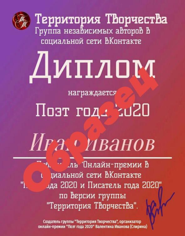 Доброго времени суток, дорогие авторы! Объявляется прием произведений и книг (в электронном формате)! ПЕРВАЯ ИНТЕРНЕТ-ПРЕМИЯ В СОЦИАЛЬНОЙ СЕТИ ВКОНТАКТЕ «КНИГА ГОДА — 2020», «ПОЭТ ГОДА — 2020» и «ПИСАТЕЛЬ ГОДА — 2020»! УСЛОВИЯ КОНКУРСА. До нового года осталось пять месяцев. Каждый месяц мы (это я Гениальный графоман и Елена Мельниченко) будем выбирать топ-5 авторов среди поэтов и топ-5 авторов среди писателей. Выбранные авторы будут награждаться памятными дипломами.