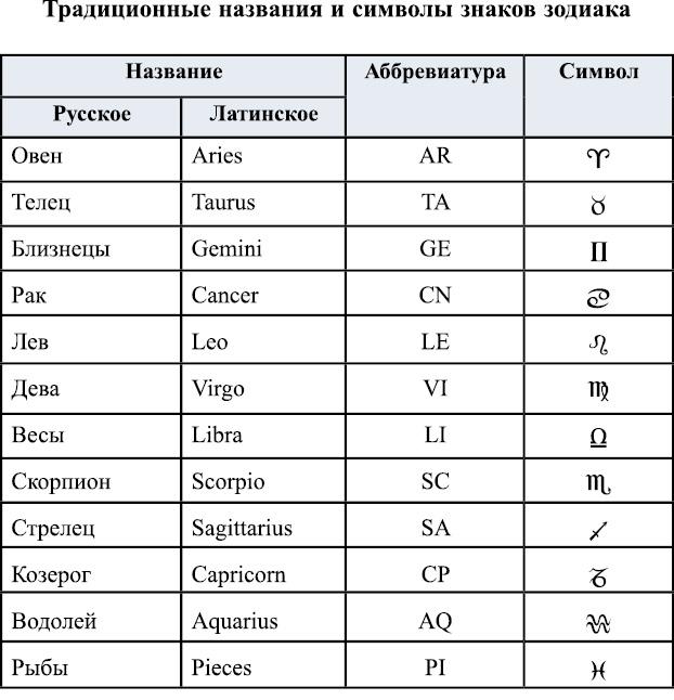 Названия знаков совпадают с названиями астрономических созвездий, расположенных вдоль эклиптики. Однако знак зодиака в астрологии и созвездие в астрономии — это не одно и то же, их границы не совпадают. Каждый знак занимает ровно 30 градусов. Зодиак ведет свой отсчет от точки, в которой Солнце находится в момент весеннего равноденствия — 21 марта. От нее отсчитываются градусы в первом знаке зодиака — Овне.