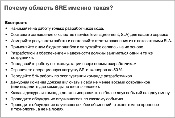Этот вопрос легко задать, но на него трудно ответить, поэтому я обратился к большой группе самых умных SR-инженеров из всех, кого я знаю, чтобы выяснить их мнение по этому вопросу (а также о культуре SRE, которую мы обсудим в главе 3). Я объединил их ответы со своим, но указывал авторство, когда это было уместно, так что в данной главе цитаты других людей будут встречаться чаще, чем обычно (чтобы заслуженно отдать им должное).