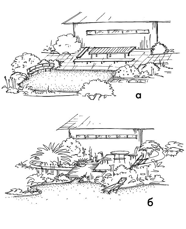 На рисунках показано решение одного и того же места отдыха, но в одном случае оно предназначено для большой и шумной компании (а), а в другом для тихого семейного круга (б). Разница в структуре, площади мощений, ширине дорожек, ассортименте растений, вариантах садовой мебели и других элементах.