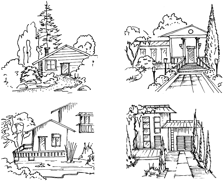 На рисунке показаны четыре фасада, различающиеся стилистическим решением. Это лишь малая часть из великого множества возможных вариантов, каждый из которых имеет право на существование.