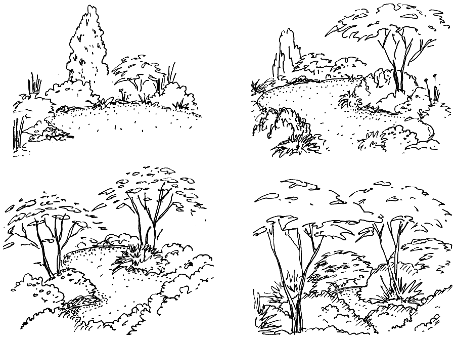 На рисунке даны варианты: от самого открытого (верхний левый рисунок) до самого закрытого (нижний правый рисунок) сада. Вряд ли кто-то захочет жить в чистом поле, а кто-то – в непроходимой лесной чаще. Однако степень «открытости» и «закрытости» участка может быть разной.