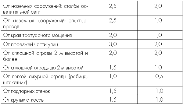 Подземные и наземные коммуникации (водопровод, канализация, газопровод, кабель связи, электрокабель, «воздушка» и т. д.) непременно должны быть нанесены на план. Там же должны присутствовать и зоны запрета (исходя из нормативов) посадки деревьев и кустарников в соответствии с положениями СНиП (см. таблицу).