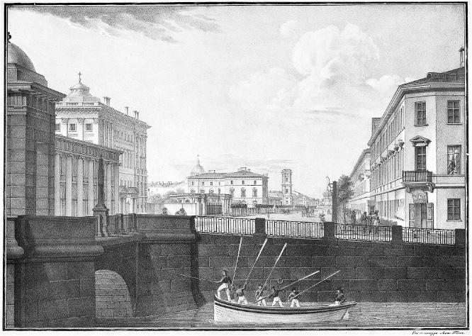 {1} Вид Фонтанки у Аничкова моста. Гравюра Александра Тона. 1820-е годы. Государственный Эрмитаж.
